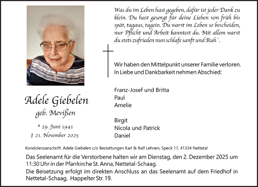 Hier finden Sie alle Traueranzeigen aus der Zeitung, die bisher für Adele Giebelen erschienen sind. Weitere Traueranzeigen, die in der Zeitung erscheinen, werden hier ebenfalls aufgelistet