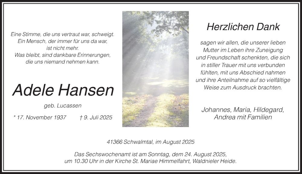 Hier finden Sie alle Traueranzeigen aus der Zeitung, die bisher für Adele Hansen erschienen sind. Weitere Traueranzeigen, die in der Zeitung erscheinen, werden hier ebenfalls aufgelistet