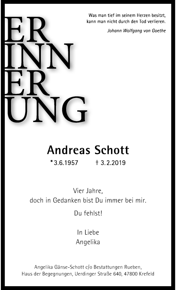 Hier finden Sie alle Traueranzeigen aus der Zeitung, die bisher für Andreas Schott erschienen sind. Weitere Traueranzeigen, die in der Zeitung erscheinen, werden hier ebenfalls aufgelistet