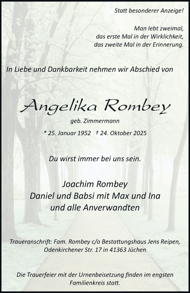 Hier finden Sie alle Traueranzeigen aus der Zeitung, die bisher für Angelika Rombey erschienen sind. Weitere Traueranzeigen, die in der Zeitung erscheinen, werden hier ebenfalls aufgelistet