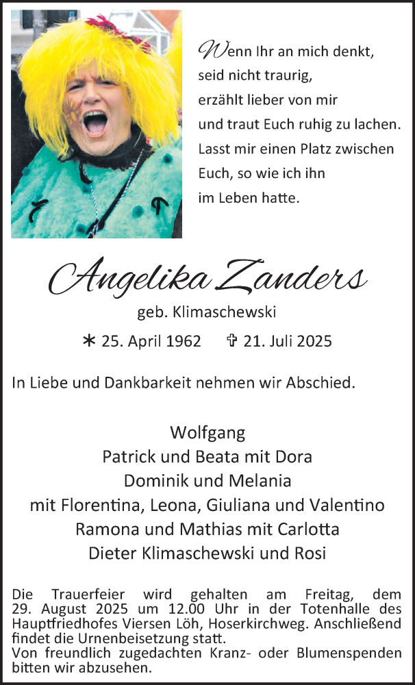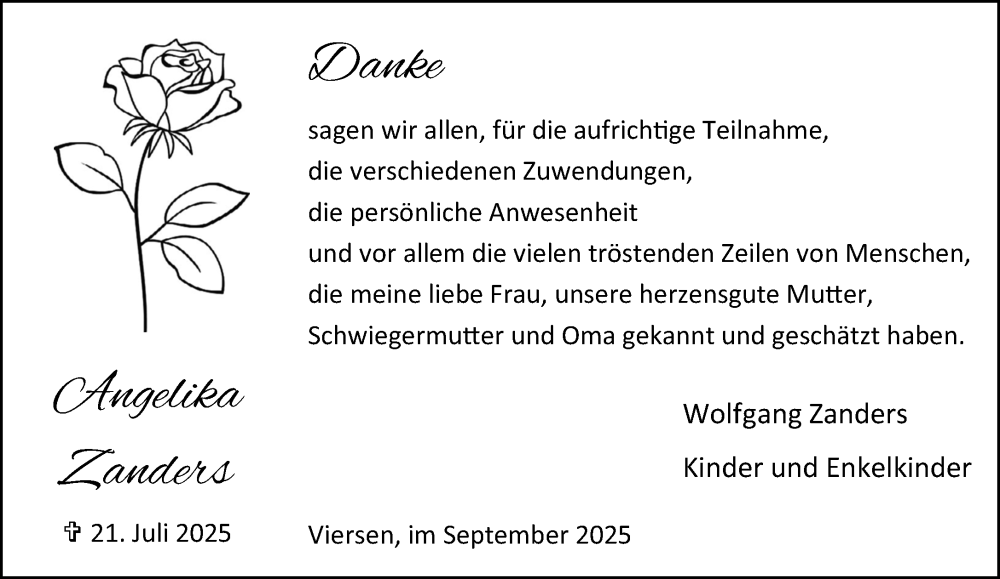 Hier finden Sie alle Traueranzeigen aus der Zeitung, die bisher für Angelika Zanders erschienen sind. Weitere Traueranzeigen, die in der Zeitung erscheinen, werden hier ebenfalls aufgelistet
