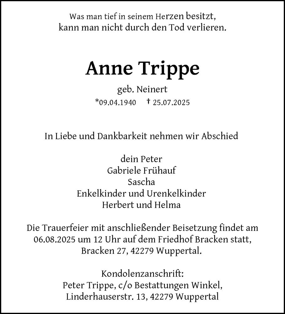 Hier finden Sie alle Traueranzeigen aus der Zeitung, die bisher für Anne Trippe erschienen sind. Weitere Traueranzeigen, die in der Zeitung erscheinen, werden hier ebenfalls aufgelistet
