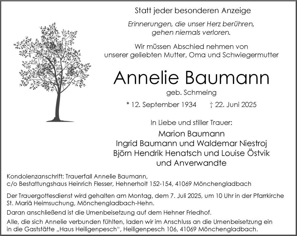 Hier finden Sie alle Traueranzeigen aus der Zeitung, die bisher für Annelie Baumann erschienen sind. Weitere Traueranzeigen, die in der Zeitung erscheinen, werden hier ebenfalls aufgelistet