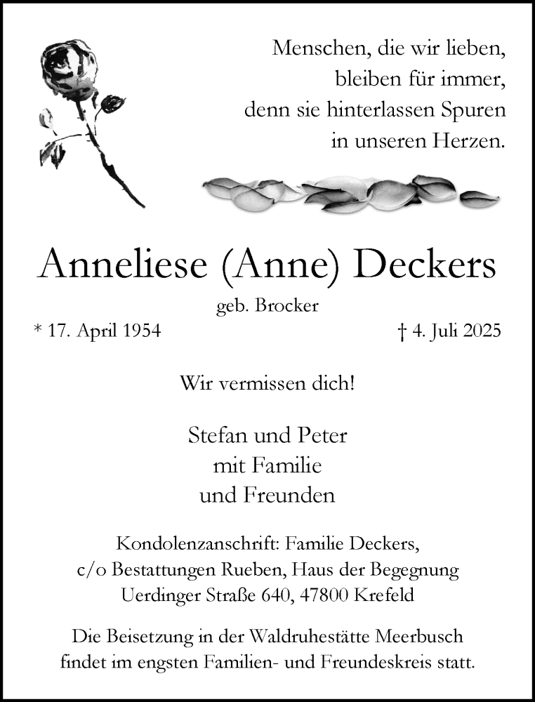 Hier finden Sie alle Traueranzeigen aus der Zeitung, die bisher für Anneliese Deckers erschienen sind. Weitere Traueranzeigen, die in der Zeitung erscheinen, werden hier ebenfalls aufgelistet