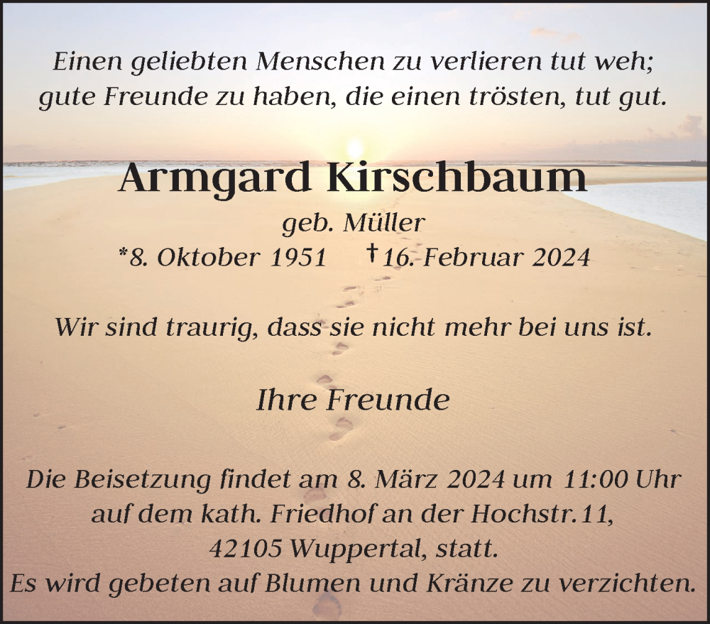 Hier finden Sie alle Traueranzeigen aus der Zeitung, die bisher für Armgard Kirschbaum erschienen sind. Weitere Traueranzeigen, die in der Zeitung erscheinen, werden hier ebenfalls aufgelistet