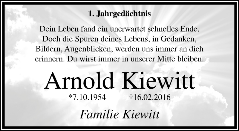 Hier finden Sie alle Traueranzeigen aus der Zeitung, die bisher für Arnold Kiewitt erschienen sind. Weitere Traueranzeigen, die in der Zeitung erscheinen, werden hier ebenfalls aufgelistet