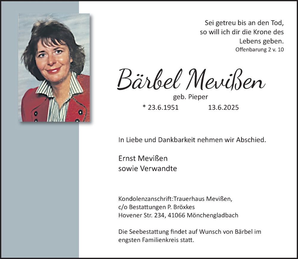 Hier finden Sie alle Traueranzeigen aus der Zeitung, die bisher für Bärbel Mevißen erschienen sind. Weitere Traueranzeigen, die in der Zeitung erscheinen, werden hier ebenfalls aufgelistet