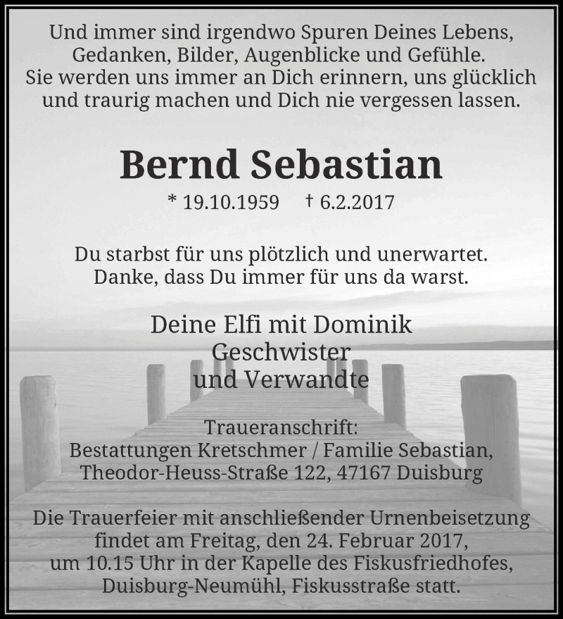 Hier finden Sie alle Traueranzeigen aus der Zeitung, die bisher für Bernd Sebastian erschienen sind. Weitere Traueranzeigen, die in der Zeitung erscheinen, werden hier ebenfalls aufgelistet