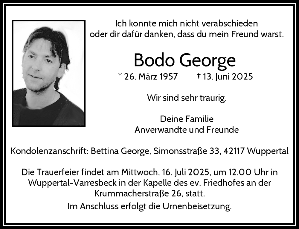 Hier finden Sie alle Traueranzeigen aus der Zeitung, die bisher für Bodo George erschienen sind. Weitere Traueranzeigen, die in der Zeitung erscheinen, werden hier ebenfalls aufgelistet