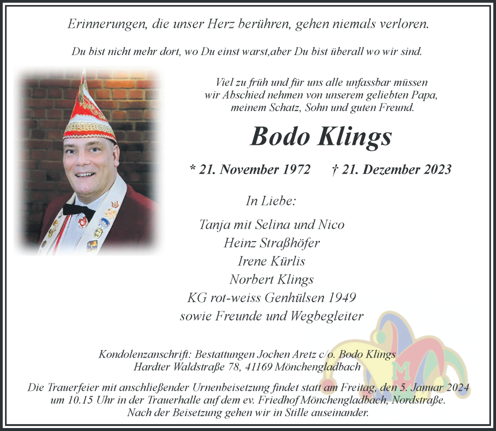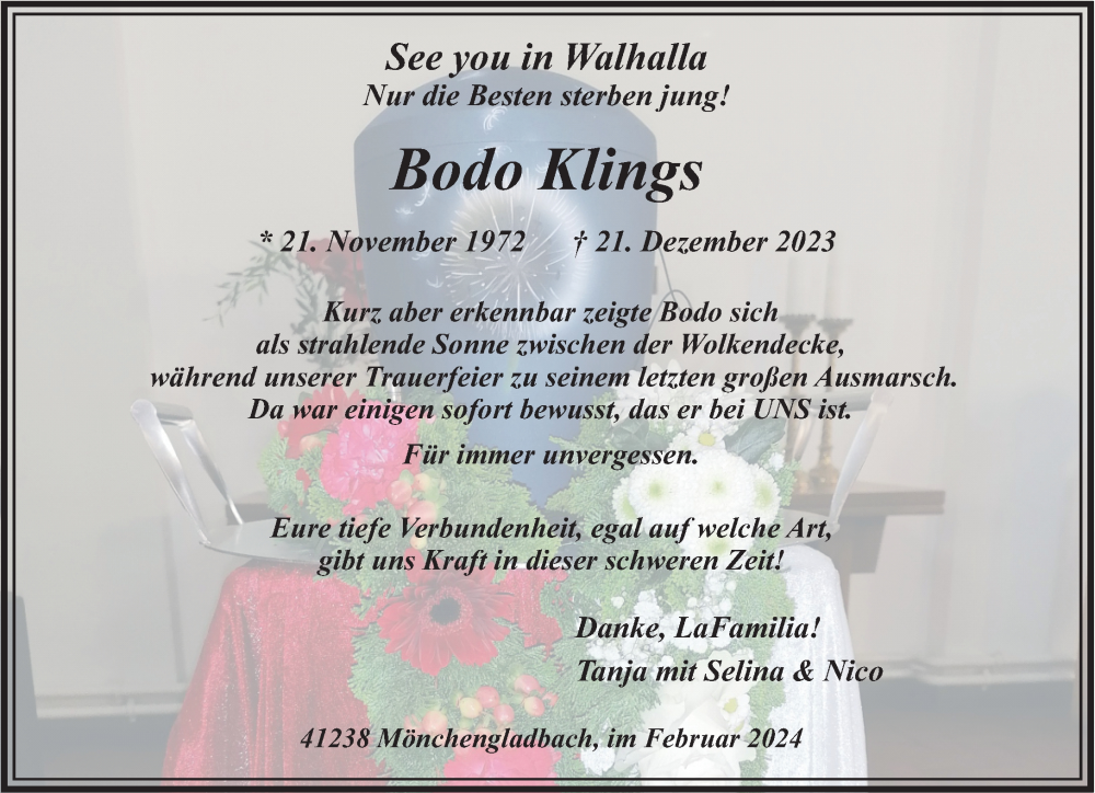 Hier finden Sie alle Traueranzeigen aus der Zeitung, die bisher für Bodo Klings erschienen sind. Weitere Traueranzeigen, die in der Zeitung erscheinen, werden hier ebenfalls aufgelistet