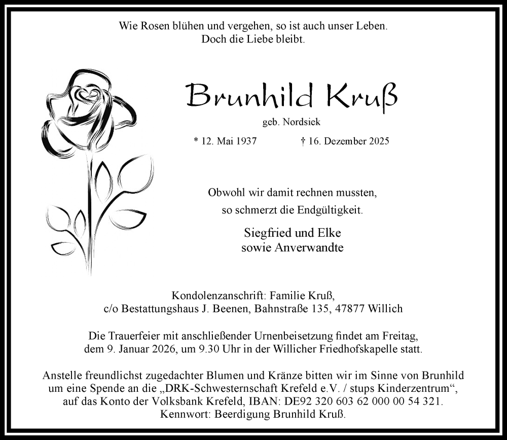 Hier finden Sie alle Traueranzeigen aus der Zeitung, die bisher für Brunhild Kruß erschienen sind. Weitere Traueranzeigen, die in der Zeitung erscheinen, werden hier ebenfalls aufgelistet