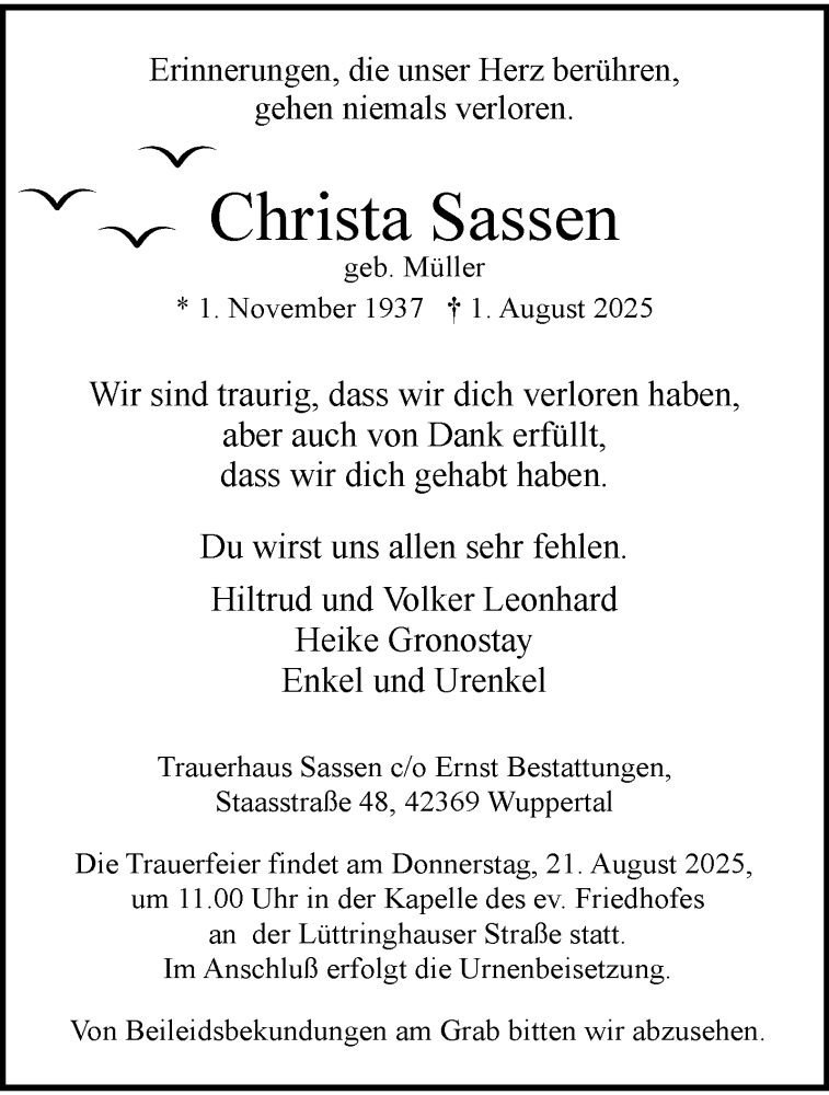 Hier finden Sie alle Traueranzeigen aus der Zeitung, die bisher für Christa Sassen erschienen sind. Weitere Traueranzeigen, die in der Zeitung erscheinen, werden hier ebenfalls aufgelistet