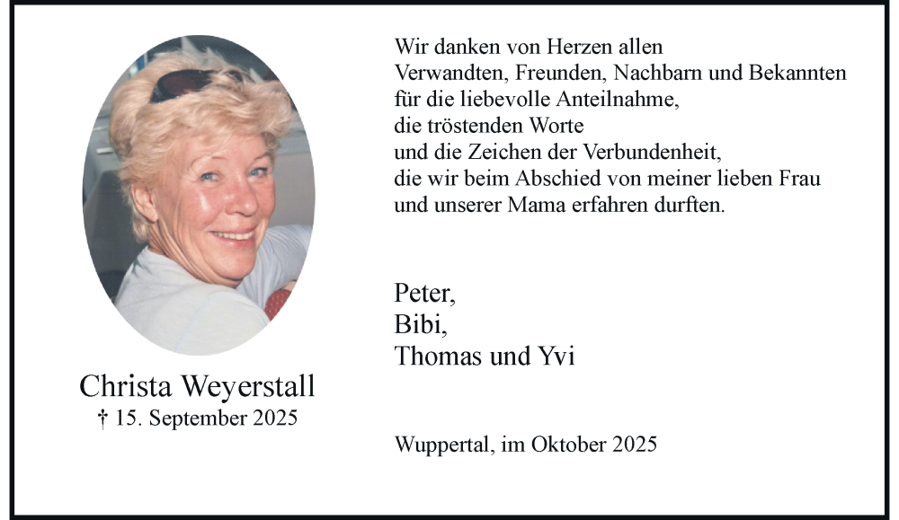 Hier finden Sie alle Traueranzeigen aus der Zeitung, die bisher für Christa Weyerstall erschienen sind. Weitere Traueranzeigen, die in der Zeitung erscheinen, werden hier ebenfalls aufgelistet