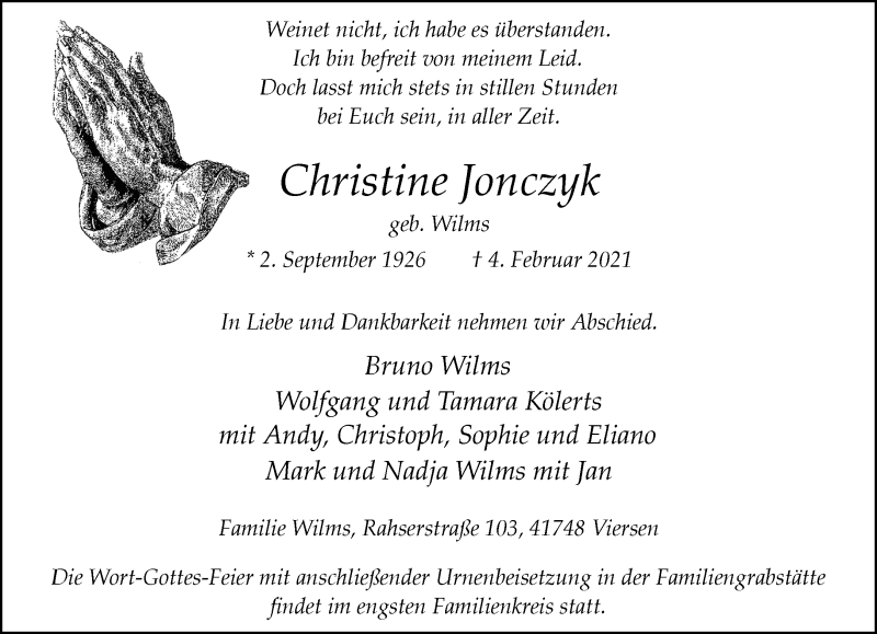 Hier finden Sie alle Traueranzeigen aus der Zeitung, die bisher für Christine Jonczyk erschienen sind. Weitere Traueranzeigen, die in der Zeitung erscheinen, werden hier ebenfalls aufgelistet