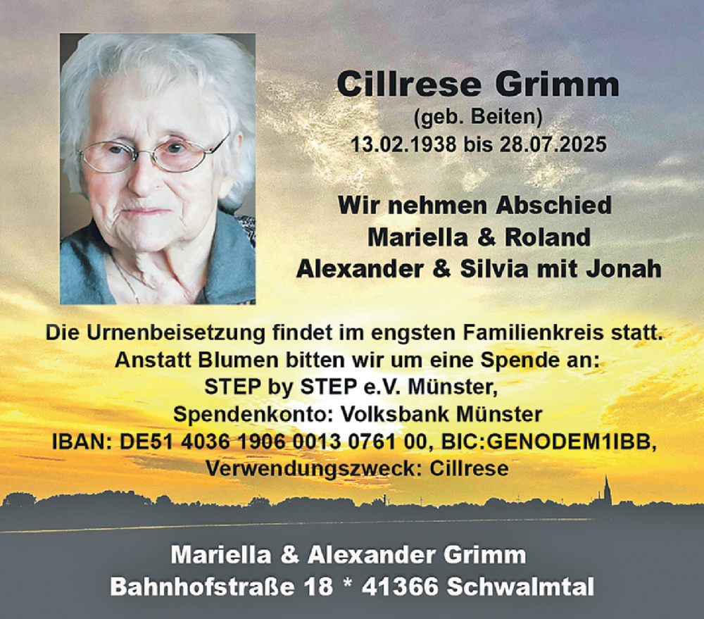 Hier finden Sie alle Traueranzeigen aus der Zeitung, die bisher für Cillrese Grimm erschienen sind. Weitere Traueranzeigen, die in der Zeitung erscheinen, werden hier ebenfalls aufgelistet