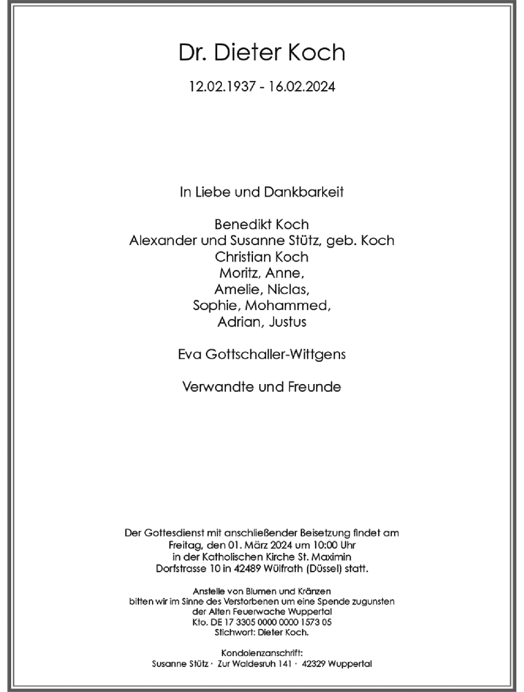 Hier finden Sie alle Traueranzeigen aus der Zeitung, die bisher für Dieter Koch erschienen sind. Weitere Traueranzeigen, die in der Zeitung erscheinen, werden hier ebenfalls aufgelistet
