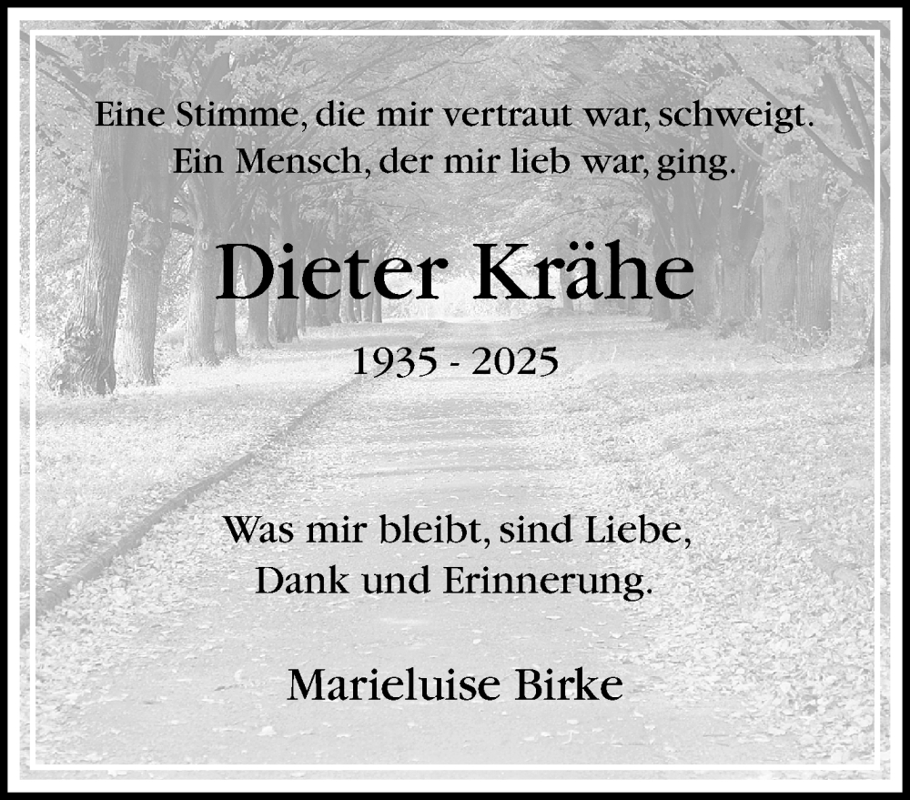 Hier finden Sie alle Traueranzeigen aus der Zeitung, die bisher für Dieter Krähe erschienen sind. Weitere Traueranzeigen, die in der Zeitung erscheinen, werden hier ebenfalls aufgelistet