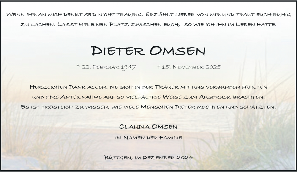 Hier finden Sie alle Traueranzeigen aus der Zeitung, die bisher für Dieter Omsen erschienen sind. Weitere Traueranzeigen, die in der Zeitung erscheinen, werden hier ebenfalls aufgelistet