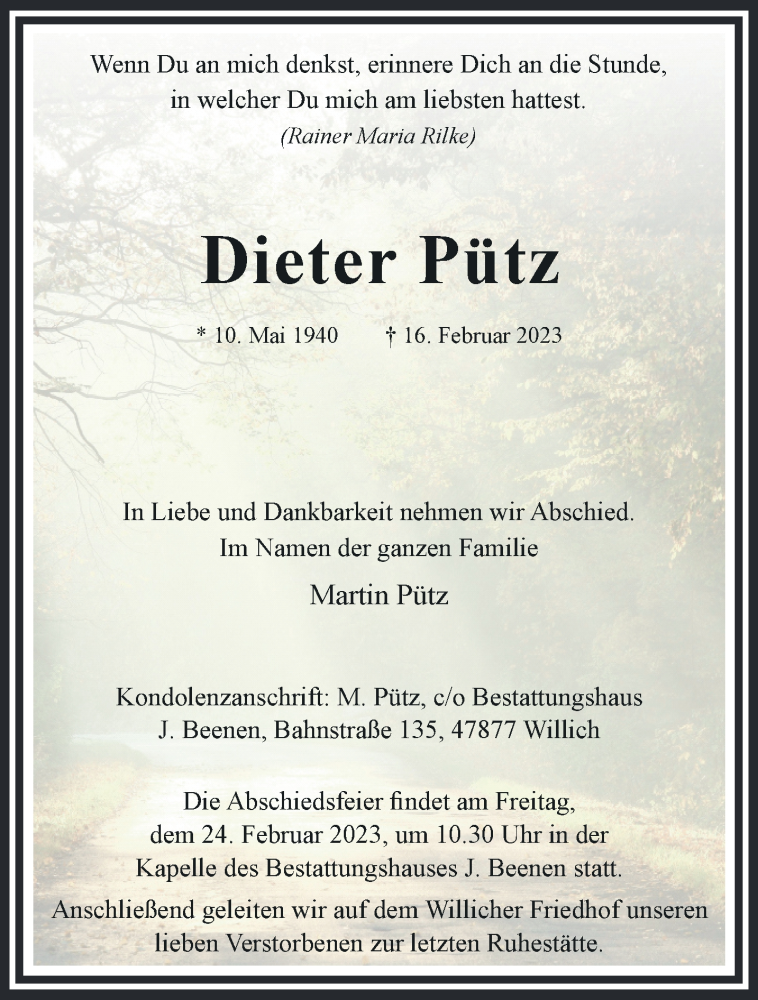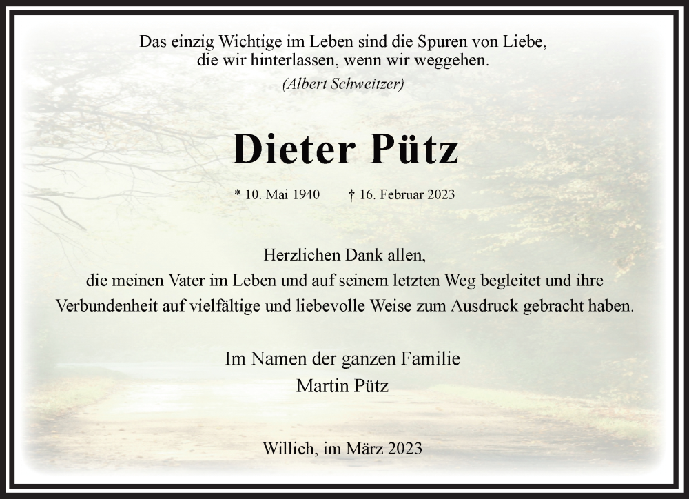 Hier finden Sie alle Traueranzeigen aus der Zeitung, die bisher für Dieter Pütz erschienen sind. Weitere Traueranzeigen, die in der Zeitung erscheinen, werden hier ebenfalls aufgelistet