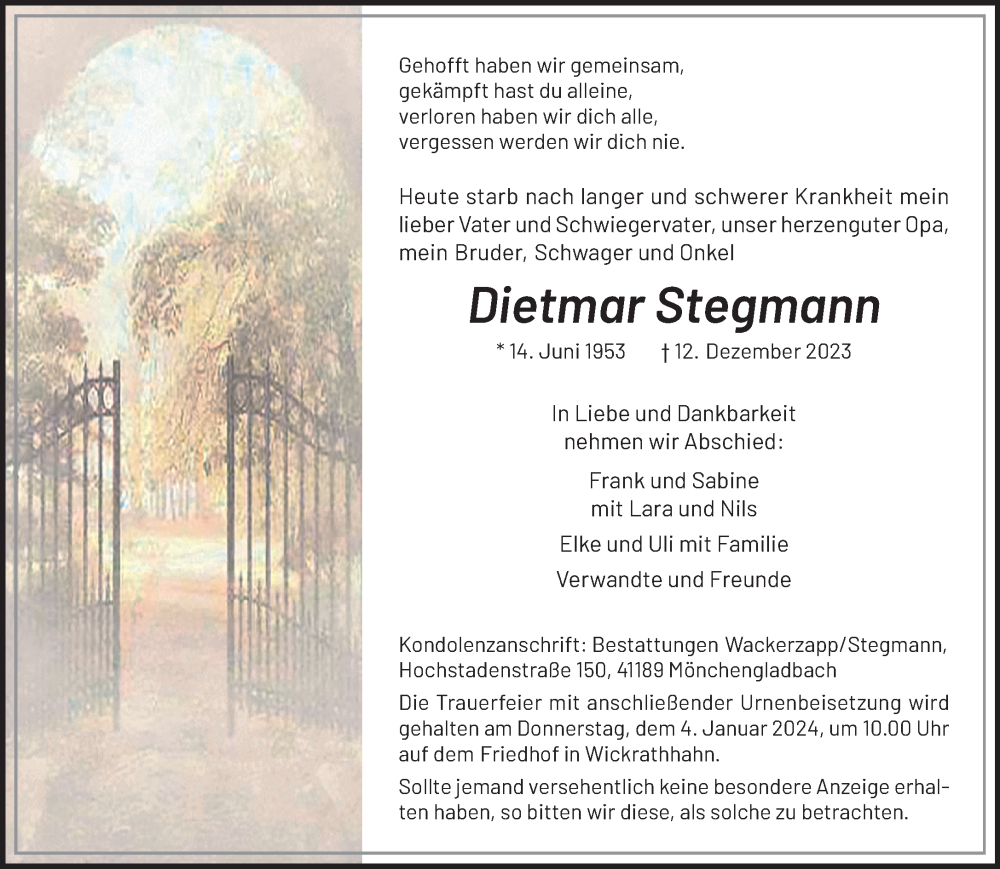 Hier finden Sie alle Traueranzeigen aus der Zeitung, die bisher für Dietmar Stegmann erschienen sind. Weitere Traueranzeigen, die in der Zeitung erscheinen, werden hier ebenfalls aufgelistet