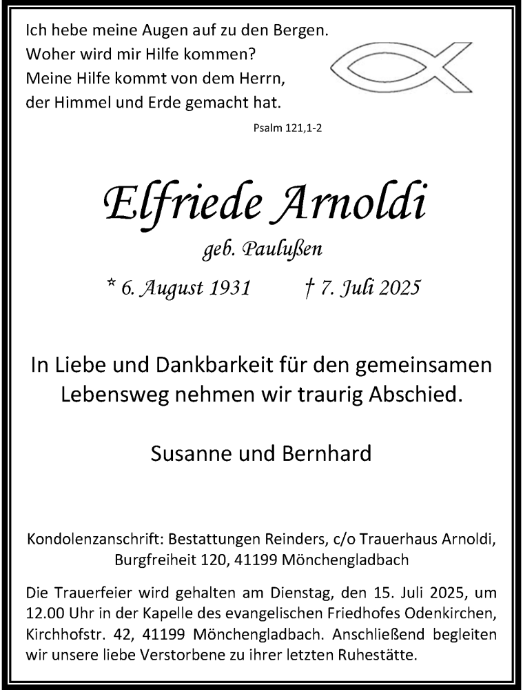 Hier finden Sie alle Traueranzeigen aus der Zeitung, die bisher für Elfriede Arnoldi erschienen sind. Weitere Traueranzeigen, die in der Zeitung erscheinen, werden hier ebenfalls aufgelistet