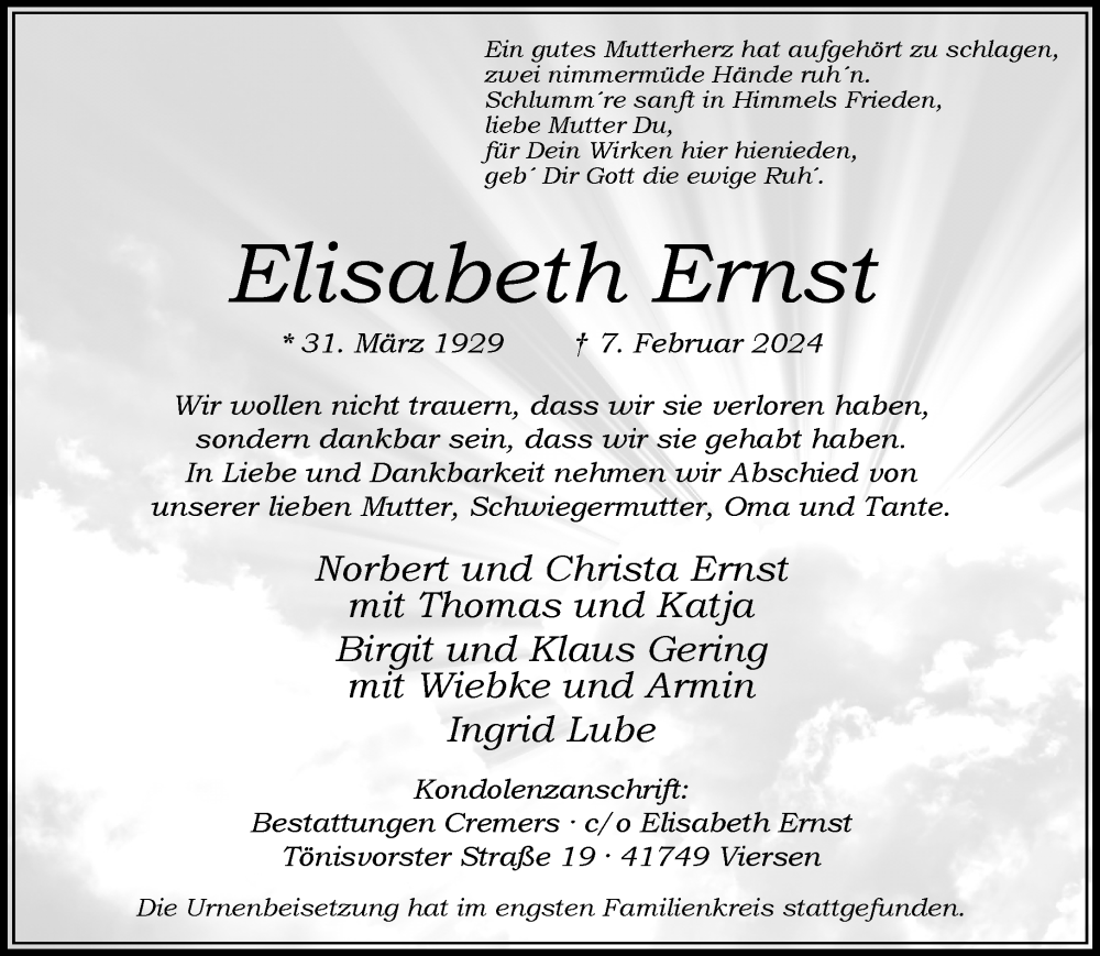 Hier finden Sie alle Traueranzeigen aus der Zeitung, die bisher für Elisabeth Ernst erschienen sind. Weitere Traueranzeigen, die in der Zeitung erscheinen, werden hier ebenfalls aufgelistet