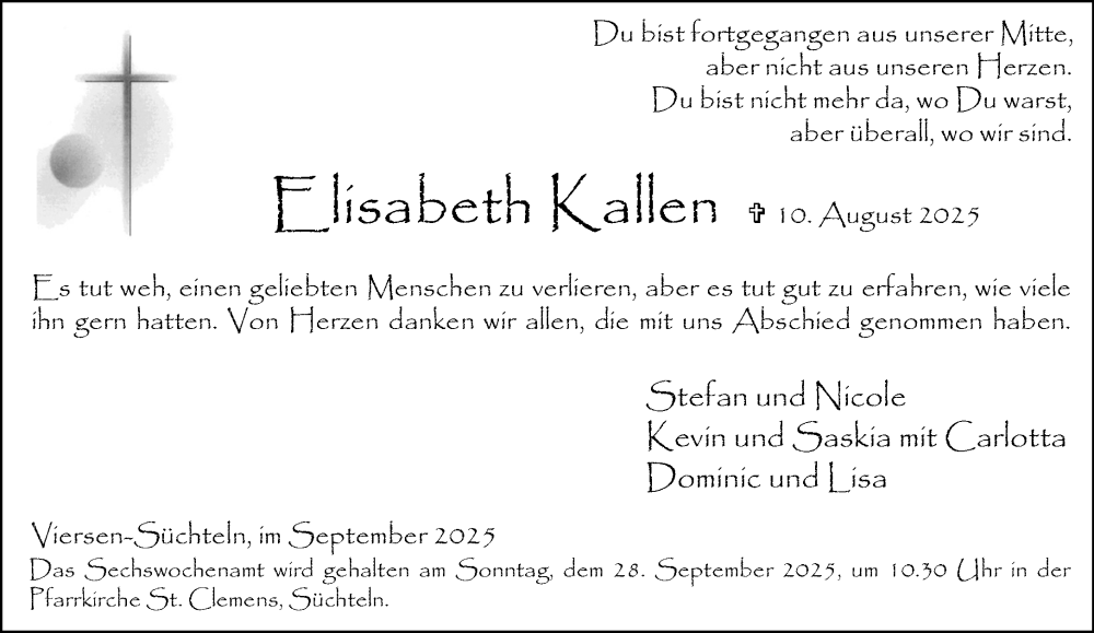 Hier finden Sie alle Traueranzeigen aus der Zeitung, die bisher für Elisabeth Kallen erschienen sind. Weitere Traueranzeigen, die in der Zeitung erscheinen, werden hier ebenfalls aufgelistet