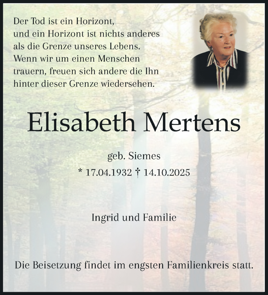 Hier finden Sie alle Traueranzeigen aus der Zeitung, die bisher für Elisabeth Mertens erschienen sind. Weitere Traueranzeigen, die in der Zeitung erscheinen, werden hier ebenfalls aufgelistet
