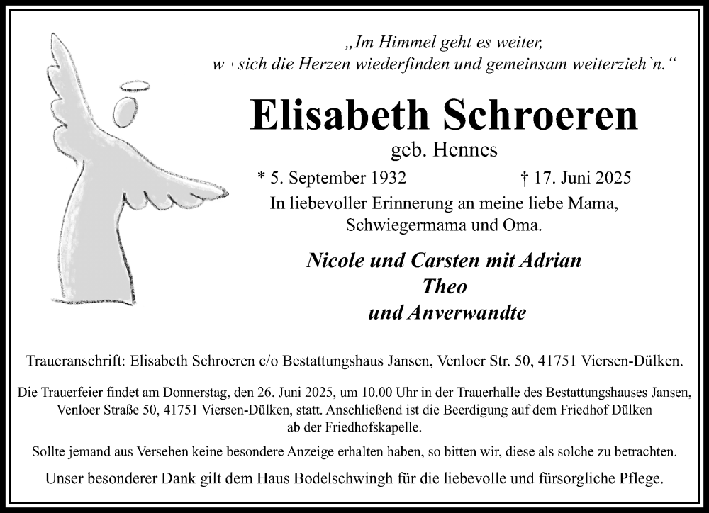 Hier finden Sie alle Traueranzeigen aus der Zeitung, die bisher für Elisabeth Schroeren erschienen sind. Weitere Traueranzeigen, die in der Zeitung erscheinen, werden hier ebenfalls aufgelistet