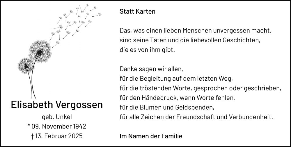 Hier finden Sie alle Traueranzeigen aus der Zeitung, die bisher für Elisabeth Vergossen erschienen sind. Weitere Traueranzeigen, die in der Zeitung erscheinen, werden hier ebenfalls aufgelistet
