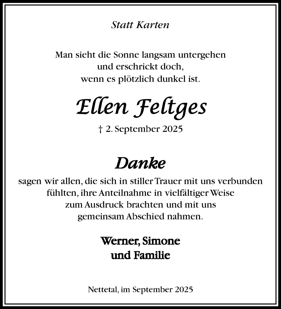 Hier finden Sie alle Traueranzeigen aus der Zeitung, die bisher für Ellen Feltges erschienen sind. Weitere Traueranzeigen, die in der Zeitung erscheinen, werden hier ebenfalls aufgelistet