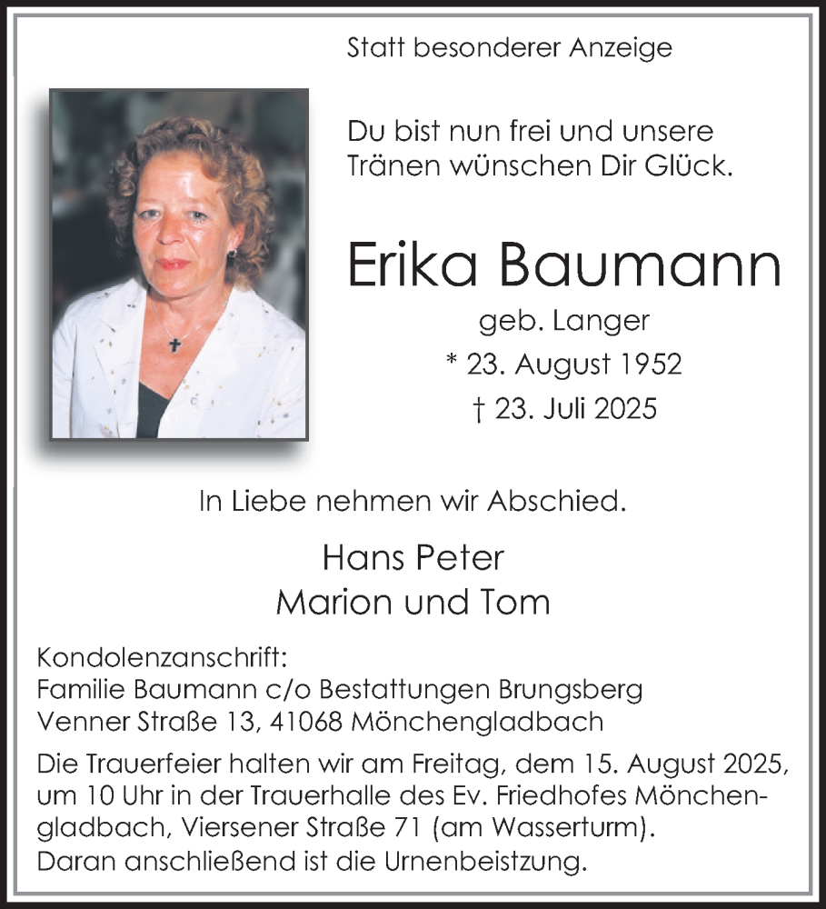 Hier finden Sie alle Traueranzeigen aus der Zeitung, die bisher für Erika Baumann erschienen sind. Weitere Traueranzeigen, die in der Zeitung erscheinen, werden hier ebenfalls aufgelistet