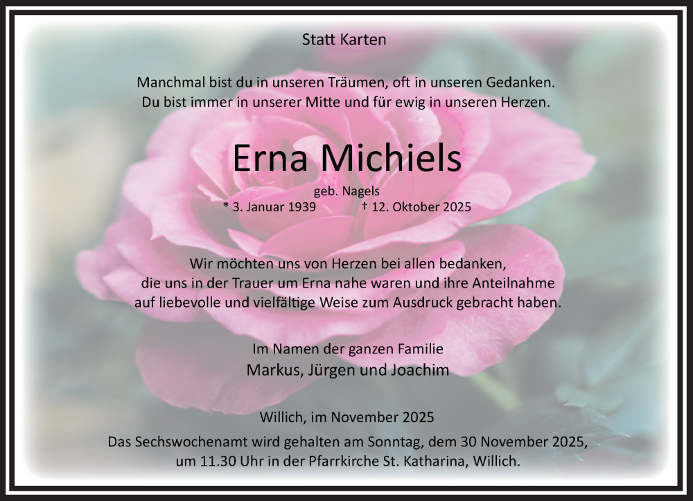 Hier finden Sie alle Traueranzeigen aus der Zeitung, die bisher für Erna Michiels erschienen sind. Weitere Traueranzeigen, die in der Zeitung erscheinen, werden hier ebenfalls aufgelistet