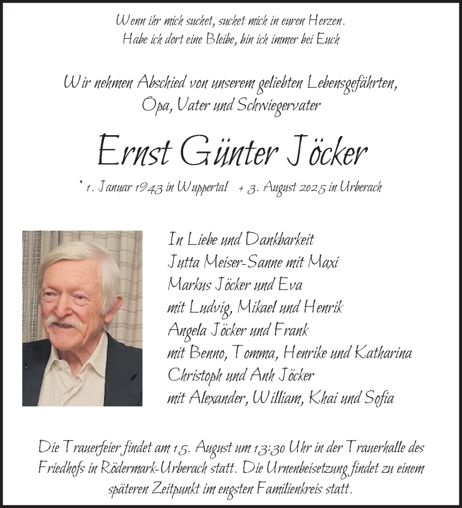 Hier finden Sie alle Traueranzeigen aus der Zeitung, die bisher für Ernst Günter Jöcker erschienen sind. Weitere Traueranzeigen, die in der Zeitung erscheinen, werden hier ebenfalls aufgelistet