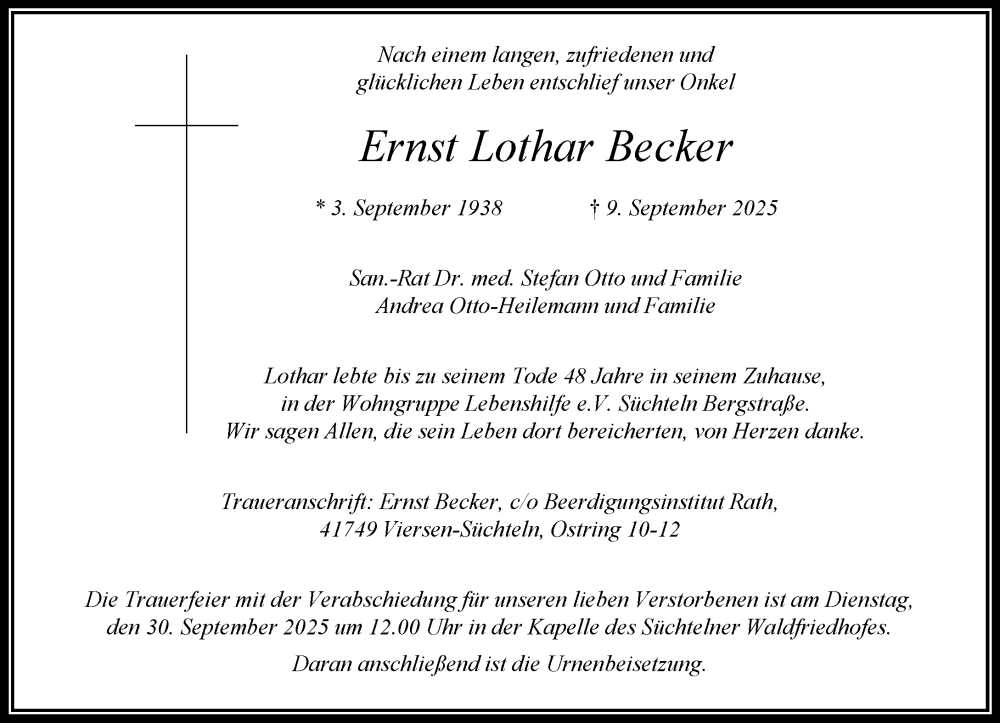 Hier finden Sie alle Traueranzeigen aus der Zeitung, die bisher für Ernst Lothar Becker erschienen sind. Weitere Traueranzeigen, die in der Zeitung erscheinen, werden hier ebenfalls aufgelistet
