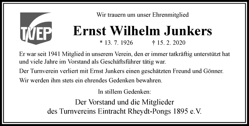 Hier finden Sie alle Traueranzeigen aus der Zeitung, die bisher für Ernst Wilhelm Junkers erschienen sind. Weitere Traueranzeigen, die in der Zeitung erscheinen, werden hier ebenfalls aufgelistet