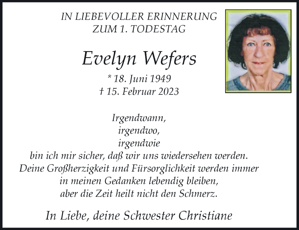 Hier finden Sie alle Traueranzeigen aus der Zeitung, die bisher für Evelyn Wefers erschienen sind. Weitere Traueranzeigen, die in der Zeitung erscheinen, werden hier ebenfalls aufgelistet