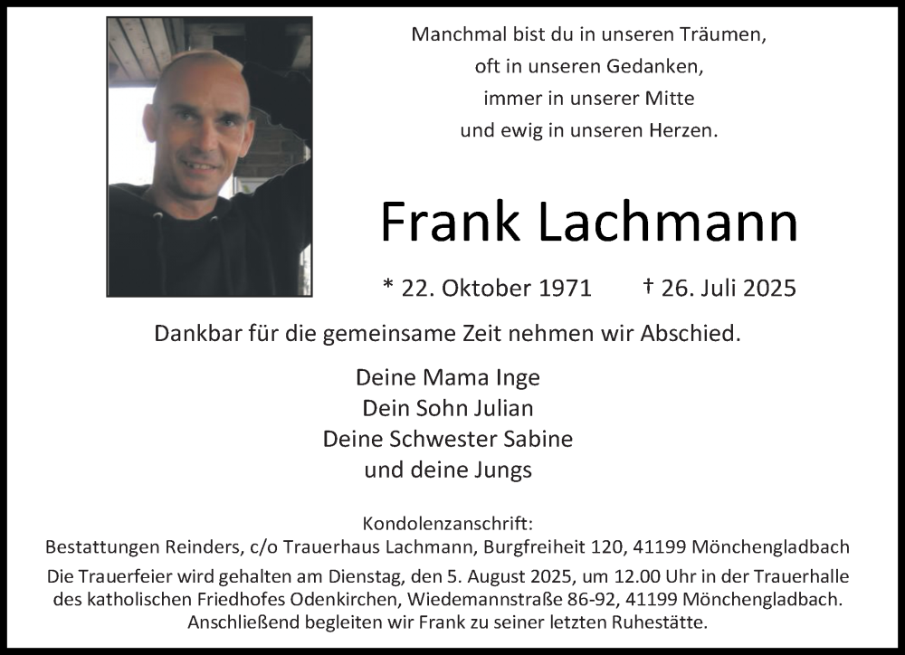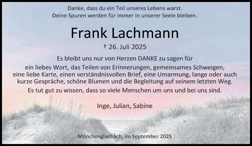 Hier finden Sie alle Traueranzeigen aus der Zeitung, die bisher für Frank Lachmann erschienen sind. Weitere Traueranzeigen, die in der Zeitung erscheinen, werden hier ebenfalls aufgelistet