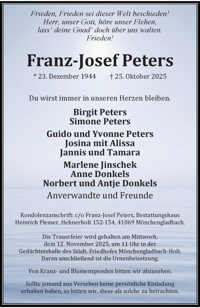 Hier finden Sie alle Traueranzeigen aus der Zeitung, die bisher für Franz-Josef Peters erschienen sind. Weitere Traueranzeigen, die in der Zeitung erscheinen, werden hier ebenfalls aufgelistet