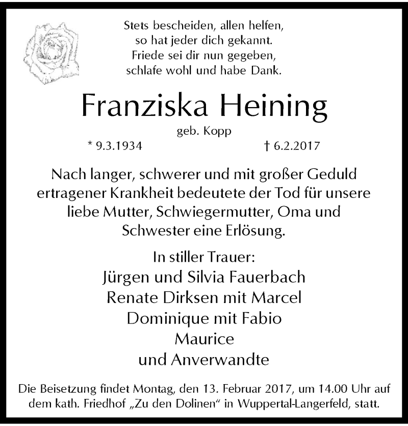 Hier finden Sie alle Traueranzeigen aus der Zeitung, die bisher für FRanziska Heining erschienen sind. Weitere Traueranzeigen, die in der Zeitung erscheinen, werden hier ebenfalls aufgelistet