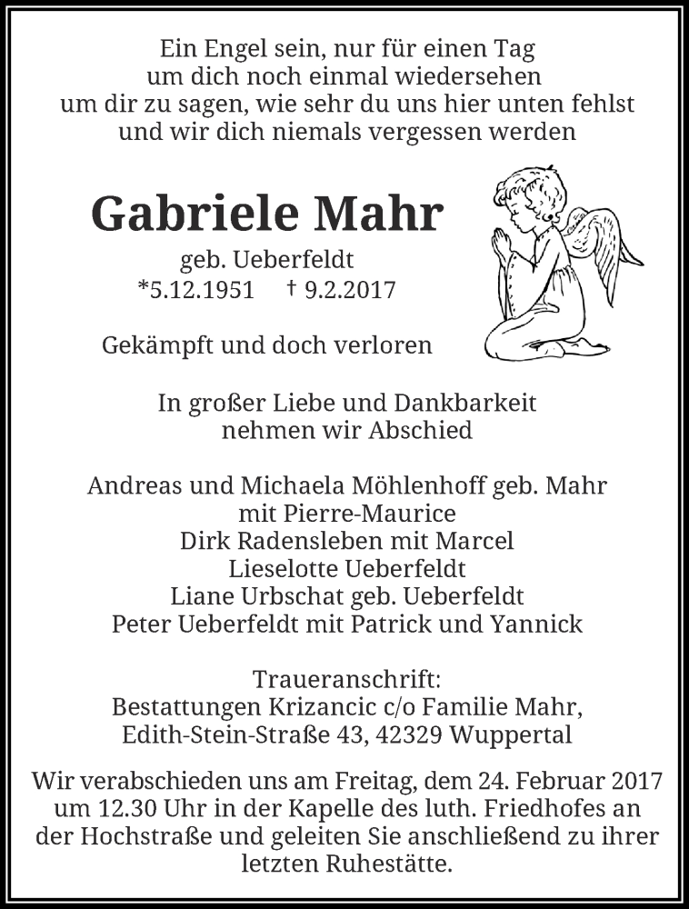 Hier finden Sie alle Traueranzeigen aus der Zeitung, die bisher für Gabriele Mahr erschienen sind. Weitere Traueranzeigen, die in der Zeitung erscheinen, werden hier ebenfalls aufgelistet