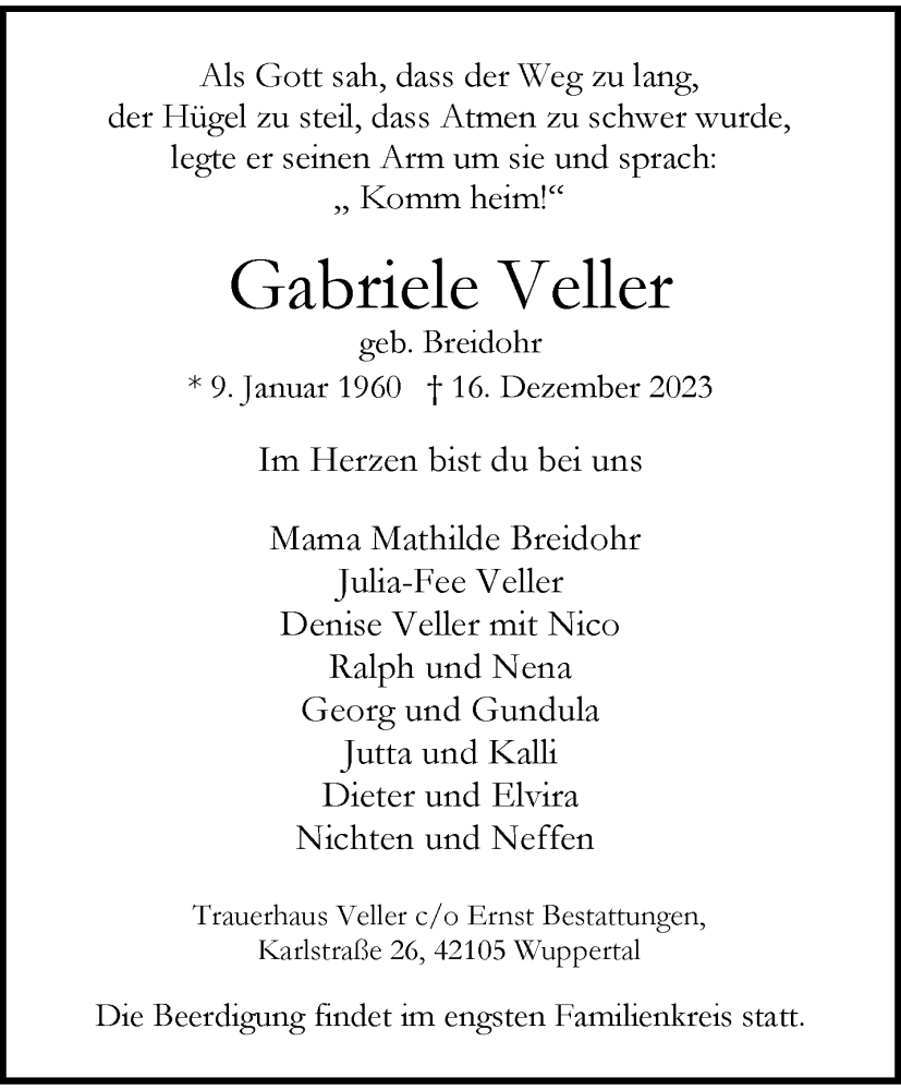 Hier finden Sie alle Traueranzeigen aus der Zeitung, die bisher für Gabriele Veller erschienen sind. Weitere Traueranzeigen, die in der Zeitung erscheinen, werden hier ebenfalls aufgelistet