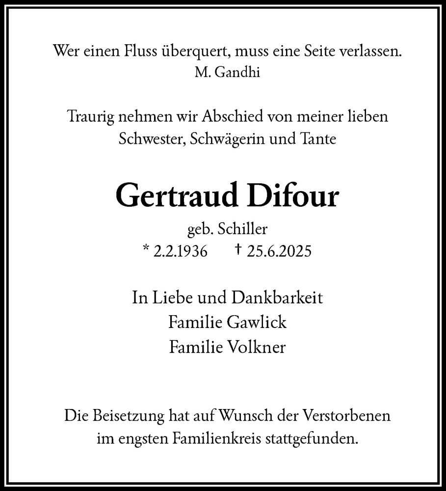 Hier finden Sie alle Traueranzeigen aus der Zeitung, die bisher für Gertraud Difour erschienen sind. Weitere Traueranzeigen, die in der Zeitung erscheinen, werden hier ebenfalls aufgelistet