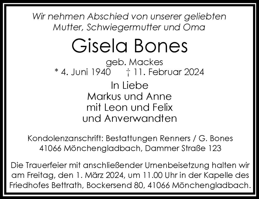 Hier finden Sie alle Traueranzeigen aus der Zeitung, die bisher für Gisela Bones erschienen sind. Weitere Traueranzeigen, die in der Zeitung erscheinen, werden hier ebenfalls aufgelistet