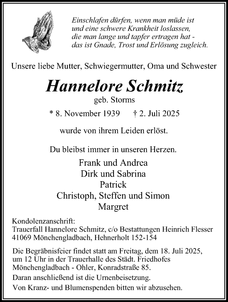 Hier finden Sie alle Traueranzeigen aus der Zeitung, die bisher für Hannelore Schmitz erschienen sind. Weitere Traueranzeigen, die in der Zeitung erscheinen, werden hier ebenfalls aufgelistet