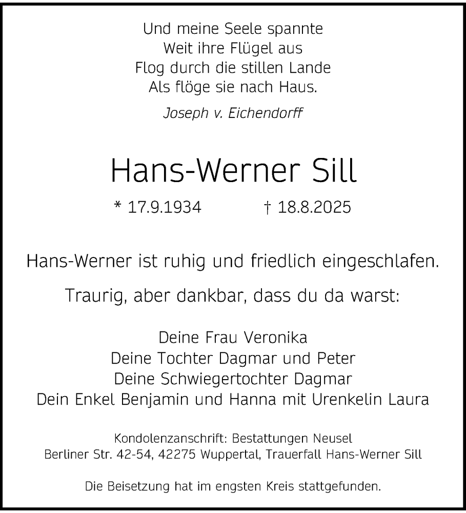 Hier finden Sie alle Traueranzeigen aus der Zeitung, die bisher für Hans-Werner Sill erschienen sind. Weitere Traueranzeigen, die in der Zeitung erscheinen, werden hier ebenfalls aufgelistet