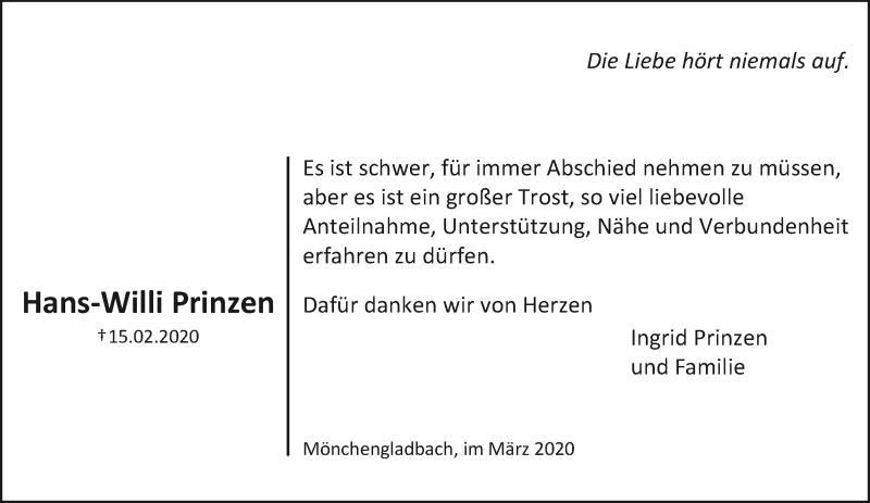 Hier finden Sie alle Traueranzeigen aus der Zeitung, die bisher für Hans-Willi Prinzen erschienen sind. Weitere Traueranzeigen, die in der Zeitung erscheinen, werden hier ebenfalls aufgelistet
