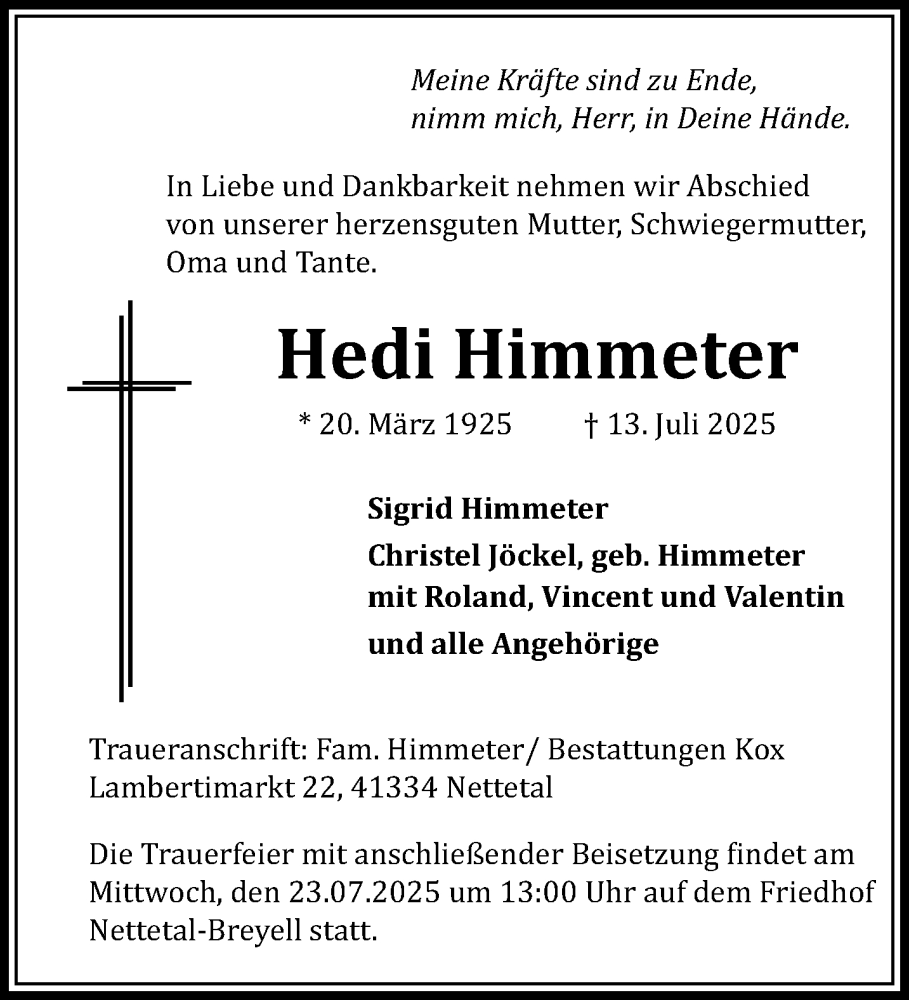 Hier finden Sie alle Traueranzeigen aus der Zeitung, die bisher für Hedi Himmeter erschienen sind. Weitere Traueranzeigen, die in der Zeitung erscheinen, werden hier ebenfalls aufgelistet