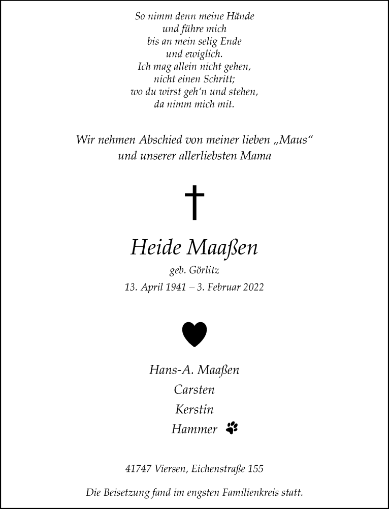 Hier finden Sie alle Traueranzeigen aus der Zeitung, die bisher für Heide Maaßen erschienen sind. Weitere Traueranzeigen, die in der Zeitung erscheinen, werden hier ebenfalls aufgelistet