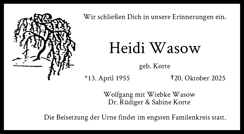 Hier finden Sie alle Traueranzeigen aus der Zeitung, die bisher für Heidi Wasow erschienen sind. Weitere Traueranzeigen, die in der Zeitung erscheinen, werden hier ebenfalls aufgelistet